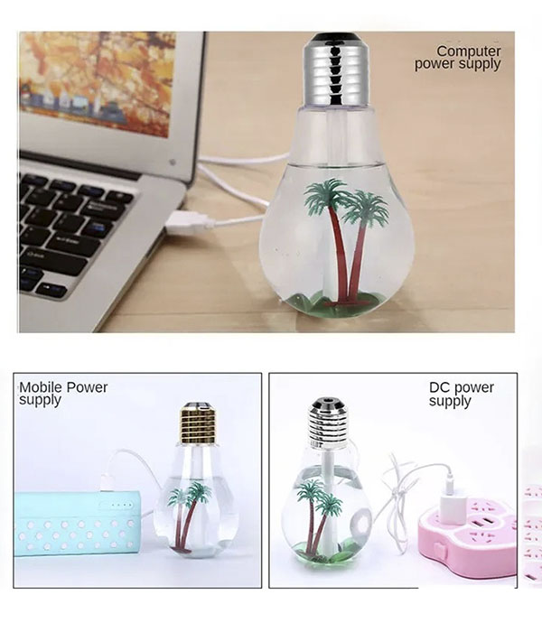 Humidificador de aire de bombilla de escritorio portátil usb, humidificador sónico luces led de noche de 7 colores encendidas/apagadas, humidificador de niebla usb portátil de 400 ml hogar, oficina, dormitorio, habitación de bebé.